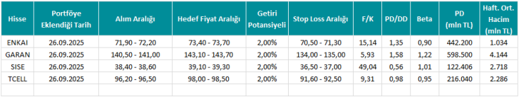 *Tablo yer alan fiyat sütunu verileri ile diğer veriler hisselerin portföye eklendiği tarihten önceki son işlem günü kapanış verileri üzerinden hesaplanmıştır.