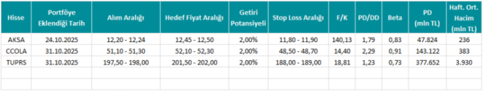 *Tablo yer alan fiyat sütunu verileri ile diğer veriler hisselerin portföye eklendiği tarihten önceki son işlem günü kapanış verileri üzerinden hesaplanmıştır.