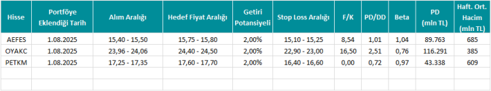 *Tablo yer alan fiyat sütunu verileri ile diğer veriler hisselerin portföye eklendiği tarihten önceki son işlem günü kapanış verileri üzerinden hesaplanmıştır.