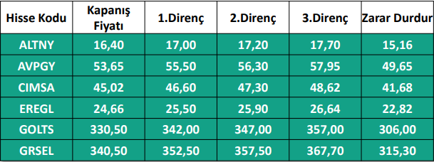 1) Haftalık Hisse Takip Listesinde yer alan hisse senetleri, Hedef Fiyat Aralığı ve Stop-Loss seviyeleri teknik analiz kriterlerine göre seçilmiştir. Liste içerisinden bireysel hisse senedi seçimi yapılması beklentilerinize uygun sonuçlar doğurmayabilir.