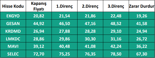 1) Haftalık Hisse Takip Listesinde yer alan hisse senetleri, Hedef Fiyat Aralığı ve Stop-Loss seviyeleri teknik analiz kriterlerine göre seçilmiştir. Liste içerisinden bireysel hisse senedi seçimi yapılması beklentilerinize uygun sonuçlar doğurmayabilir.