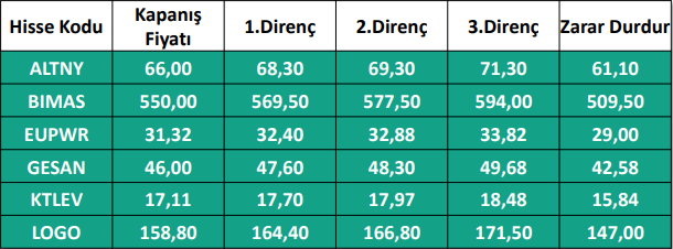 1) Haftalık Hisse Takip Listesinde yer alan hisse senetleri, Hedef Fiyat Aralığı ve Stop-Loss seviyeleri teknik analiz kriterlerine göre seçilmiştir. Liste içerisinden bireysel hisse senedi seçimi yapılması beklentilerinize uygun sonuçlar doğurmayabilir.