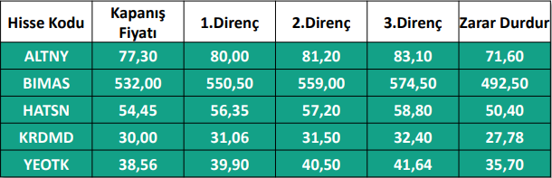 1) Haftalık Hisse Takip Listesinde yer alan hisse senetleri, Hedef Fiyat Aralığı ve Stop-Loss seviyeleri teknik analiz kriterlerine göre seçilmiştir. Liste içerisinden bireysel hisse senedi seçimi yapılması beklentilerinize uygun sonuçlar doğurmayabilir.