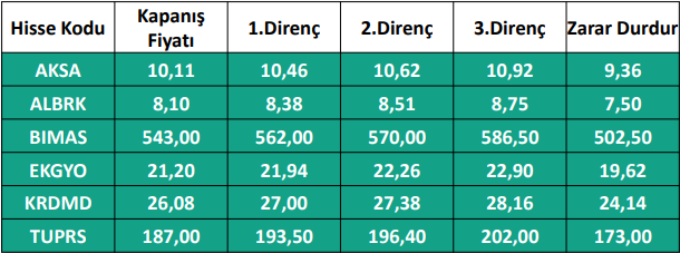1) Haftalık Hisse Takip Listesinde yer alan hisse senetleri, Hedef Fiyat Aralığı ve Stop-Loss seviyeleri teknik analiz kriterlerine göre seçilmiştir. Liste içerisinden bireysel hisse senedi seçimi yapılması beklentilerinize uygun sonuçlar doğurmayabilir.
