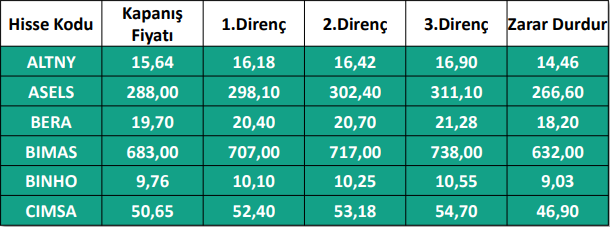 1) Haftalık Hisse Takip Listesinde yer alan hisse senetleri, Hedef Fiyat Aralığı ve Stop-Loss seviyeleri teknik analiz kriterlerine göre seçilmiştir. Liste içerisinden bireysel hisse senedi seçimi yapılması beklentilerinize uygun sonuçlar doğurmayabilir.