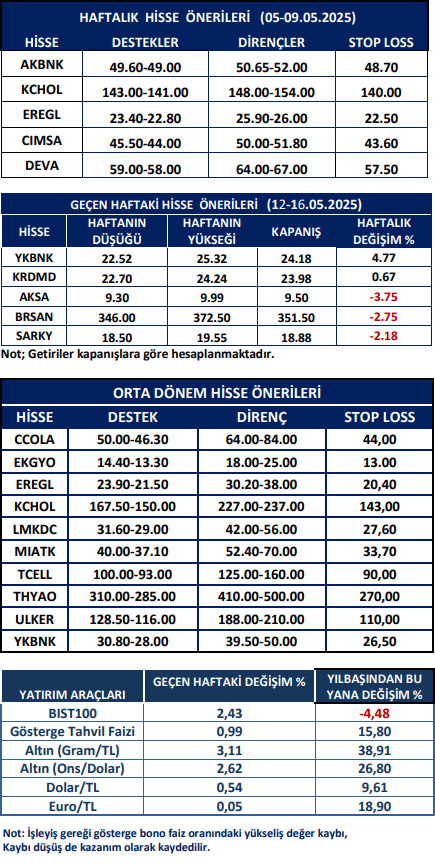 Dış piyasalar İsviçre’deki ABD ile Çin arasındaki müzakerelere odaklandı. Trump Cumartesi yapılan ilk görüşmelerin iyi geçtiğini açıkladı. Trump daha önce Avrupa Birliği ülkeleri ve Japonya başta olmak üzere diğer ülkelerle gümrük tarifelerini normal seviyelerine çekmişti. Görüşmelerde gümrük oranlarının %60’a kadar çekileceğine dair tahminler yapılırken Trump Çin’e %80 gümrük vergisi doğru görünüyor dedi. Bu durum tüccar zihniyetiyle pazarlık için tarifeyi yüksek tutup sonra aşağıya çekmek niyetiyle tam da uyuşuyor. Çin ile anlaşma sağlanırsa piyasalara olumlu etkileri olacaktır. Piyasalarda diğer gündem konularına ise duyarsızlık var. Fed geçen haftaki toplantısında beklendiği üzere faizi sabit bıraktı. Bu açıdan piyasalar üzerindeki etkileri zayıf kaldı. Fed Başkanı Powell toplantı sonrası yaptığı açıklamalarda, tarifelere bağlı olarak işsizlik ve enflasyon konusunda belirsizliğin arttığını söylerken faiz indirimi için “bekle gör” tavrını sürdürdü. Toplantı sonrası faiz indirim olasılıkları biraz daha zayıfladı ve temmuz sonrasına ötelendi. Bu durum dolara biraz değer kazandırdı. İngiltere Merkez Bankası ise beklentilere paralel 25 baz puanlık indirimine giderken Çin Merkez Bankası da geçen hafta faiz ve zorunlu karşılıkları aşağıya çekti. Avrupa’da faizler uzun bir zamandır zaten düşüş sürecinde.