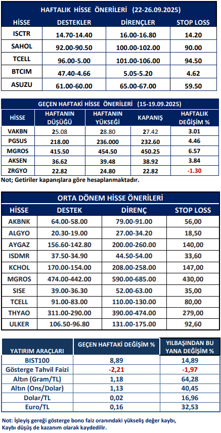 Dış piyasalarda Fed faiz indirimine ilişkin iyimserlik sürüyor. Toplantıdan sürpriz çıkmadı ve 25 baz puanlık indirimle faiz %4.25’e olarak belirlendi. Beklentiler ağırlıklı olarak 25 baz puanlık indirim olduğu için piyasalar üzerindeki etkisi sınırlı kaldı. İstihdam verilerinin zayıf gelmesi sonrası 50 baz puanlık indirim olasılığı dillendirmeye başlanmıştı. Kısmen de fiyatlara dahil olmuştu. Ancak Fed Başkanı Powell, istihdamdaki aşağı yönlü baskıya karşılık enflasyondaki yukarı yönlü riskler nedeniyle dengeyi bulmaya çalıştıklarını söyledi. Powell faiz indiriminde seri düşüş sürecinin başladığı algısının yanlış olduğunu söylerken bu yıl için iki, 2026 için bir faiz indirimi beklentisi öngörüldü. Toplantı sonrası piyasalarda ekim ve aralık toplantılarında faiz indirimi geleceği beklentileri ağırlık kazandı. Bu durum olumlu seyrin devamında oldukça etkili oldu.