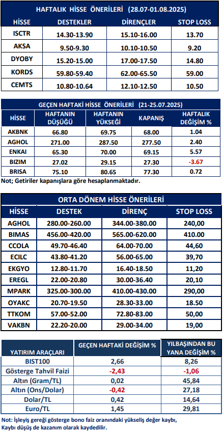 Piyasalarda gündem yoğun. TCMB’den gelen 300 baz puanlık indirim beklentileri karşılarken piyasalara yansımaları olumlu oldu. Karar sonrası borsada “beklenti bitti” satışları gelse de çok sınırlı kaldı. Piyasalar bir süredir olası bir faiz indirimini fiyatlıyordu. BIST100 Endeksi’ni 9 binli seviyelerden 10 binin üzerine taşıyan önemli gerekçelerden biri de faiz indirim beklentisiydi. Bu açıdan faiz kararı sonrası kısa süreli satış denemelerini olağan karşılamak gerekir. Toplantı metnindeki “Yakın döneme ilişkin veriler, talep koşullarının dezenflasyonist etkisinin arttığını göstermektedir.” vurgusu önümüzdeki dönemde de faiz indirimlerinin devamının geleceği şeklinde değerlendirildi. 2025 yılı içinde 3 toplantı daha var. Bu açıdan bakılınca faiz konusunda yeni bir gelişme en azından bir süre daha olmayacak. Ancak Perşembe günkü faiz kararı önümüzdeki döneme ilişkin bir moral kaynağı oldu. Hem faiz indirim sürecinin başlaması hem de piyasaların beklenti ihtiyacını karşılayacak “havuç” işlevi görecek bir gelişme. Yıl sonu için %35 faiz tahminleri ağırlık kazanıyor. Bu tahmine ulaşmada enflasyon belirleyici olacak. Enflasyon hızında belirgin bir yavaşlama var. Döviz kurlarının seyri yine bu aşamada belirleyici biri olacak. Faiz piyasaların ve ekonominin en önemli göstergelerinden biridir. Bu açıdan piyasaların olduğu kadar reel ekonominin de seyrini önemli ölçüde etkiler. Orta vadede yavaşlayan ekonomiye bir can suyu olmasının yanı sıra yüksek finansman giderleri sorununun hafiflemesine de neden olabilir. Faiz düşüşünün piyasalardaki ilk etkileri borsa üzerinde oldu. Borsalar bugünü olduğu kadar geleceği de fiyatlar. Faiz borsaların en ciddi rakibidir. Stopaj artışını da dikkate aldığımızda faiz gelirlerinin azalması diğer alternatiflere olumlu yansıyacaktır. Reel faiz konusuna da dikkat çekmek yararlı olacak. Faizle birlikte enflasyon da düşüyorsa reel faiz önemli ölçüde korunacak demektir. Enflasyon için yıl sonu tahminleri %24 ile %29 aralığında, TCMB faiz tahmini ise %35 gibi şekilleniyor. Stopajı hesaba katsak da enflasyona karşı az veya çok bir koruma sağlıyor. Borsa için bu bağlamda, faiz indirimi bir güç verse de çok güçlü beklentiler ve trendler “henüz” oluşmuş değil. Kabaca bir hesapla BIST100 Endeksi 14.000-14.500 seviyesine yükselir ise faiz getirisini karşılayacak. Borsa bu seviyeye ulaşır diye bir garantiden söz etmek mümkün değil. Belki bu seviyeyi geçecek, belki bu noktanın altında kalacak? Belirsizlik var. Ama diğer tarafta garantili bir getiri söz konusu. Hisse bazında çok daha yüksek getiriye sahip olanlar çıkacaktır o ayrı. Mevduattan borsaya bir kayma olabilir mi sorusuna net bir cevap vermek bu aşamada zor. Önümüzdeki dönemde, reel ekonominin hızlanmasıyla güçlü şirket bilançoları görmeye başlarsak durum daha farklı olabilir. Gelecek haftadan itibaren 06/2025 dönem bilançoları daha yoğun şekilde açıklanmaya başlayabilir. Konsolide olmayan şirketlere ilişkin 2. çeyrek finansal sonuçları KAP’a son gönderme tarihi 11 Ağustos 2025, konsolide şirketler için ise 19 Ağustos 2025 olarak belirlendi. Bu açıdan bir süre bilanço takip edeceğiz. Bilançolarla ilgili beklentiler 03/2025 veya 12/2024 dönemlerinden çok farklı değil. Enflasyon muhasebesi ve ekonomideki yavaşlama süreci geçen çeyrekte korunduğuna göre bu dönem bilançoları için de çok güçlü beklentiler yok. Bununla birlikte her dönem olduğu gibi çok iyi performans gösteren şirketler de çıkacaktır. Bir diğer nokta, son dönemde hisse bazlı hareketlenmelerde bilanço beklentilerinden çok faiz düşerse hangi sektör veya hisselere daha çok yarar gibi bir anlayış öne çıkmış durumda. Cuma akşamı Moody’s’den gelen Türkiye’nin kredi not artışının piyasalar üzerindeki etkisi olumlu ancak sınırlı kalabilir.