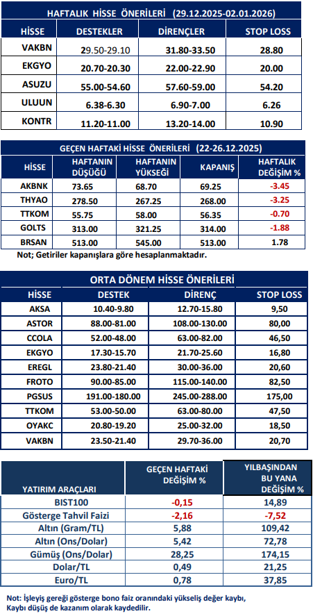 Önümüzdeki yıla devreden bakiyeye ve olası gelişmelere bakıldığında; Borsa İstanbul 2026 yılına primsiz ve nispeten ucuz bir görünüm ile başlıyor. BIST100 fiyat kazanç oranı ise 14 seviyelerinde. Bu açıdan ucuz değil, ancak pahalı olduğunu söylemek de zor. Şirket kârlarını törpüleyen enflasyon muhasebesi kalkacak olursa daha ucuz hale gelebilir. Borsa görünüm itibariyle iyi bir potansiyel barındırıyor. Özellikle mart/2025 ayından itibaren siyasetin gölgesinde kalmıştı. Siyaset sınırlayıcı bir işlev gördü. Bir bakıma borsadaki çıkış beklentilerine siyaset izin verdiği ölçüde demek doğru olacak. Devam eden “terörsüz Türkiye” sürecinde anayasa değişikliklerinin gündeme gelmesi olası. Bu açıdan siyaset hep takipte kalacak. TCMB faiz kararları yine önemini koruyacak. Enflasyondaki düşüş ve buna bağlı olarak TCMB faiz indirimlerinin devamı bekleniyor. Borsanın en ciddi rakibinin faiz olduğu savından hareketle bu durum piyasalarda olumlu fiyatlamaya konu olacak. Faiz düştükçe tasarrufların riskli varlıklara yani borsaya daha fazla ilgi göstermesi beklenebilir. Yatırımlar akışkandır. Primliden primsize doğru zaman içinde yolculuk eder. Ayrıca altın ve gümüşteki ciddi kazançlar cebe atılmak istenir, kâr realizasyonu yaşanırsa borsaya akış daha muhtemel hale gelir. 2025 yılında yabancı yatırımcıların tavrı da yerliden farklı değildi. Türkiye’nin ülke risk puanı (CDS) 206 seviyesine geriledi. 600-700 gibi seviyelerden geliyordu. Halen yatırım yapılabilir seviyenin altında bulunan Türkiye’nin kredi notunda ciddi iyileşmeler var. Ocak ayında 2026 yılının ilk değerlendirmeleri gelecek. Olası bir not artışı yabancı yatırımcıların Türkiye’ye ilgisini artırabilir. Son haftalarda Türkiye’deki dezenflasyon ve TCMB faiz indirim süreciyle zayıf da olsa alımlar gözleniyor. 19 Aralık ile biten haftada; Yabancı yatırımcılar 354 milyon dolarlık hisse senedi, 202 milyon dolarlık tahvil bono aldılar. Toplamda 556 milyon dolarlık sıcak para girişi son üç haftanın en yüksek rakamı gerçekleşti. Yine son üç haftalık hisse senetleri alımı ise 535 milyon dolara ulaştı. Dikkat çeken diğer gelişme 192 milyar dolara ulaşan TCMB rezervlerinde görüldü. 2023 Haziran ayından itibaren uygulanan ekonomik programla yükselen faiz ve TL’deki değerlenme ile rezervlerde ciddi bir artış gerçekleşti. 2023 öncesi eksi net rezerv söz konusuydu. Enflasyon ile mücadele çerçevesinde yüksek faizle talep ve döviz kurlarının baskılanması esasına dayanan program iç ve dış finans çevrelerinde kabul gördü. Her nimetin bir külfeti hesabı, zayıf büyüme, hayat pahalılığı ve özellikle bütçede artan faiz giderleri gibi çok belirgin yansımaları ortaya çıktı. Yeni asgari ücreti de bu çerçevede düşünmek yerinde olacak. Faizler son aylarda düşüş gösterse de 2025 yılının önemli bir bölümünde yüksek kaldı ve borsayı baskıladı. 2026 yılında da mevcut program ve parasal sıkılaşma sürecek. Faizde düşüş sürecinin sektör bazında yansımaları da önemli olacak. Faize en duyarlı sektör olan bankalar lokomotif olarak önemini koruyacak. Teknoloji, perakende, hizmet sektöründe (Aselsan, BIMAS, Migros, THYAO, Pegasus) yine takipte olacak. Temmuz 2024 ayından bu yana yatay bantta hareket eden Borsa İstanbul bazı önemli çekincelerine rağmen 2026 yılına daha umutlu giriyor.