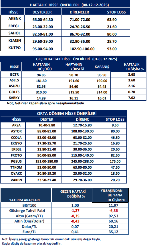 Piyasalar enflasyon verileri sonrası TCMB kararına odaklandı. TÜFE’deki değişim 2025 yılı Kasım ayında bir önceki aya göre %0,87, bir önceki yılın Aralık ayına göre %29,74, bir önceki yılın aynı ayına göre ise %31,07 artış olarak gerçekleşti. Beklentilerin oldukça altında gelen rakama rağmen piyasalar üzerindeki etkisi sınırlı kaldı. Bir süredir aylık %1.25 medyan beklenti olarak fiyatlanıyordu. Enflasyon verisiyle borsadaki yükseliş denemeleri satış fırsatı olarak kullanıldı. Bu durum “beklenti bitti” algısına bağlanabilir. Ayrıca çekirdek ve hizmet enflasyonunun manşete göre yüksek kaldığı, ocak ayında enflasyonun yüksek geleceği gibi gerekçe gösterenler de oldu. Ancak manşet enflasyonunun fiyatlamalara daha fazla temel teşkil ettiği kabul gören bir durum. Faize en duyarlı sektör bankalar olduğu için BIST100 Endeksi’ndeki düşüş ve yükselişlere banka hisselerinin yön vermesi olağan bir durum. Şimdi dikkatler 11 Aralık’taki TCMB toplantısına çevrildi. Kasım enflasyon verisiyle TCMB’nin bu toplantıda faiz indirimine kesin gözle bakılıyor. Aksi düşünüldüğünde büyük sürpriz olur. 100 veya 150 baz puanlık beklentiler telaffuz ediliyordu. Son tahlilde 150 baz puan daha fazla ağırlık kazandı. Bunu aşan bir faiz indirimi olur mu? Bunu yine de olasılık dahilinde tutmakta yarar var. Enflasyon ve faiz tarafında piyasaların bir süredir beklediği ve istediği gelişmeler olmasına rağmen özellikle borsa üzerindeki yansımaları zayıf kaldı. Son dönemde olumlu fiyatlamaya konu olan en önemli çıpa beklenen işlevi görmedi. Siyasi gelişmelerin son günlerde gündemden geriye çekilmesiyle ekonomik verilerin daha fazla fiyatlamalara konu olacağı ve bu durumun da BIST100 Endeksi’ne olumlu yansıyacağı şeklindeki algı en azından şimdilik çok gerçeklik kazanmadı. Borsada trend direnç bölgesi geçilemedi ve bu noktalardan gelen satışlarla dirençler daha da kuvvetlendi. Borsa önümüzdeki günlerde olası yeni bir çıkış hareketinde hangi beklentiyi kullanacak da bu seviyeler geçilecek sorusunun cevabı bu aşamada artık çok net değil. Siyasette gerginlik azalmış, enflasyon hızı düşüyor, faiz büyük olasılıkla düşecek, buna rağmen kırılmayan dirençler nasıl olacak da geçilecek? Daha doğru soru, neden şimdi geçilemedi. Cevabı yine talep ve para girişlerinin yetersizliği noktasında aramak gerekecek. Yerli ve yabancı yatırımcı halen hisse senetlerine mesafeli duruyor. BIST100 Endeksi bir hareketlilik kazansa ilgi de artabilir. Uzun süredir faiz ve altın gibi yatırım araçlarında kalmış, iyi gelir elde etmiş yatırımcının borsada kazanırım umudunun yeniden yeşermesi için bir canlanmanın görülmesine ihtiyaç var. Ayrıca daha fazla para girişi gerekiyor diyebiliriz. Borsa için gelen yorumlarda sıkça teleafuz edilen ucuz ve primsiz olmasının yanı sıra yıl sonu veya yılbaşı rallisi bekleyenler fazla. O zemin de hazır gibi. Ama borsanın mevcut görünümü henüz bu beklentilere cevap vermiş değil. TCMB faiz kararı sonrası bu görünüm değişebilir mi? Değişmesi gerekir. Ancak son enflasyon verileriyle ilgili fiyatlamaların içinde zaten belli ölçüde faiz indirim beklentisi de var. TCMB tarafından açıklanan 28 Kasım ile biten haftaya ait verilere göre; Yabancı yatırımcılar hisse senetlerinde 9 milyon dolarlık satış, tahvil bonoda ise 594 milyon dolarlık alım yaptılar. Yabancı yatırımcılar son 5 haftadır tahvil bonoda kesintisiz alımdalar. Bu sürede toplam alımları 2 milyar doları geçti. Faizde düşüş beklentileri veya diğer ülkelere nazaran göreceli olarak Türkiye’deki yüksek faizler alımlarını artırmış olabilir. Türkiye halen dünyanın en yüksek faiz veren birkaç ülkesinden biri. Kasım enflasyonu ile gösterge tahvil bonodaki düşüş eğilimi ivme kazandı. Para piyasaları faiz indirimini sermaye piyasalarından daha ciddi fiyatlıyor. Yabancıların hisse senetlerine ilgisi ise zayıf kalmaya devam ediyor. Türkiye’nin 5 yıllık ülke risk primi (CDS) 2018 yılından bu yana en düşük seviyelerinde. Geçen hafta 230’ün altını test etti. Aynı hafta, yurtiçi yerleşiklerin döviz mevduatında 2.2 milyar dolarlık, TCMB brüt rezervlerinde ise 2.6 milyar dolarlık artış gözlendi. Yurt içi yerleşiklerin döviz mevduatındaki artışta yine faizde düşüş etkisini hesaba katmak gerekecek. TCMB rezervlerinde devam eden yükselişle rezerv yeterliliği sağlanmakla birlikte piyasalarda olası dalgalanmalarda güvence işlevi görüyor. Döviz kurlarındaki yükselişlerde TCMB’nin müdahale gücünün olması için rezervler önemli. Döviz kurları enflasyon ile mücadele açısından kritik konumda.