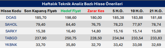Haftalık Teknik Analiz Bazlı Hisse Önerileri
