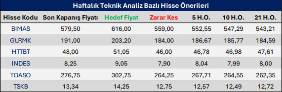 Haftalık Teknik Analiz Bazlı Hisse Önerileri