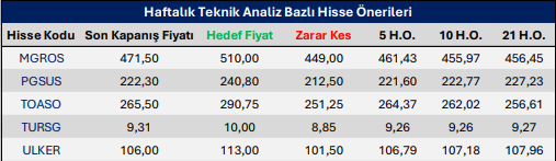 Haftalık Teknik Analiz Bazlı Hisse Önerileri