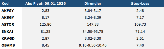 * Haftalık Teknik Takip Listelerinde (“Teknik Liste”) yer alan hisse senetleri, dirençler ve Stop-Loss seviyeleri teknik analiz kriterlerine göre seçilmiştir. Liste içerisinden bireysel hisse senedi seçimi yapılması beklentilerinize uygun sonuçlar doğurmayabilir.