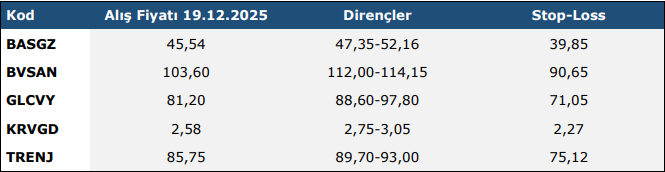 * Haftalık Teknik Takip Listelerinde (“Teknik Liste”) yer alan hisse senetleri, dirençler ve Stop-Loss seviyeleri teknik analiz kriterlerine göre seçilmiştir. Liste içerisinden bireysel hisse senedi seçimi yapılması beklentilerinize uygun sonuçlar doğurmayabilir.