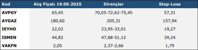 * Haftalık Teknik Takip Listelerinde (“Teknik Liste”) yer alan hisse senetleri, dirençler ve Stop-Loss seviyeleri teknik analiz kriterlerine göre seçilmiştir. Liste içerisinden bireysel hisse senedi seçimi yapılması beklentilerinize uygun sonuçlar doğurmayabilir.