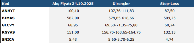 * Haftalık Teknik Takip Listelerinde (“Teknik Liste”) yer alan hisse senetleri, dirençler ve Stop-Loss seviyeleri teknik analiz kriterlerine göre seçilmiştir. Liste içerisinden bireysel hisse senedi seçimi yapılması beklentilerinize uygun sonuçlar doğurmayabilir.