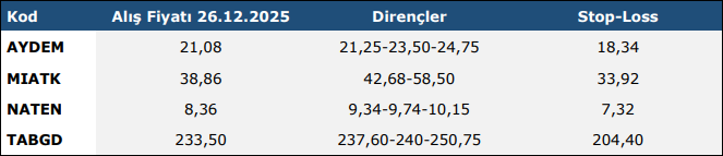 * Haftalık Teknik Takip Listelerinde (“Teknik Liste”) yer alan hisse senetleri, dirençler ve Stop-Loss seviyeleri teknik analiz kriterlerine göre seçilmiştir. Liste içerisinden bireysel hisse senedi seçimi yapılması beklentilerinize uygun sonuçlar doğurmayabilir.