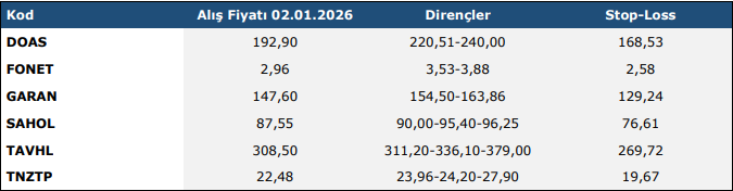 * Piyasa koşullarının uygun görülmediği haftalarda teknik takip listesi oluşturulmamaktadır.