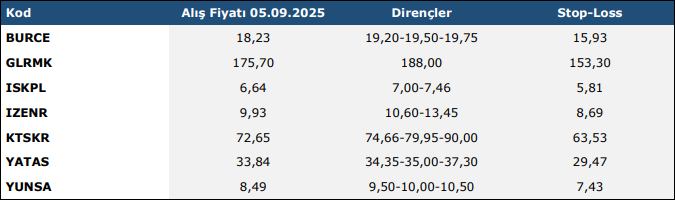 * Haftalık Teknik Takip Listelerinde (“Teknik Liste”) yer alan hisse senetleri, dirençler ve Stop-Loss seviyeleri teknik analiz kriterlerine göre seçilmiştir. Liste içerisinden bireysel hisse senedi seçimi yapılması beklentilerinize uygun sonuçlar doğurmayabilir.