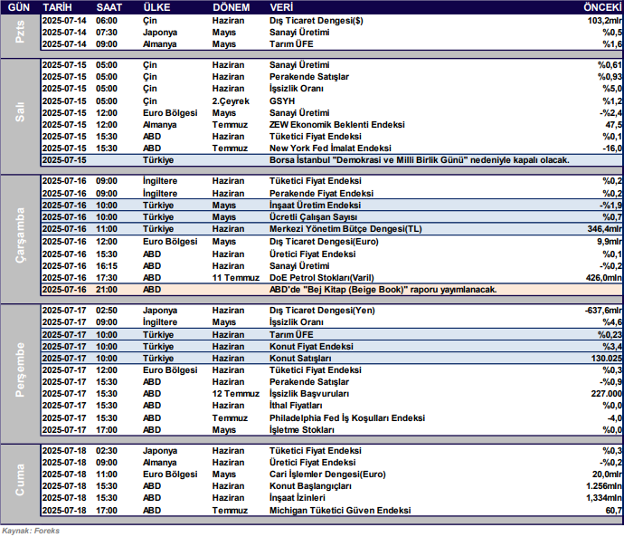 verileri takip edilecek. Ayrıca Salı günü Borsa İstanbul “Demokrasi ve Milli Birlik Günü” nedeniyle kapalı olacak.