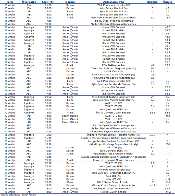 Ekonomik Veri Takvimi 15 – 19 Aralık 2025