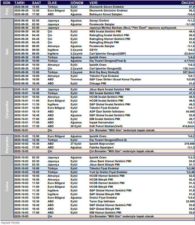 verileri takip edilecek. Salı günü Japonya Merkez Bankası (BoJ),”Fikir Özeti” raporunu açıklayacak. Ayrıca Çarşamba, Perşembe ve Cuma günü Çin Borsaları “Milli Gün” nedeniyle kapalı olacak.