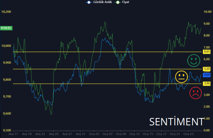 Sentiment kritik seviyeler: Aşağıda 3.30 ve 3.96 ; yukarıda ise 5.20 ve 6.65 Yukarı yönlü hareketlerde aşılması gereken kritik seviye 5.20 direncidir. Bu seviyenin geçilmesi durumunda piyasada bir rahatlama görülebilir.