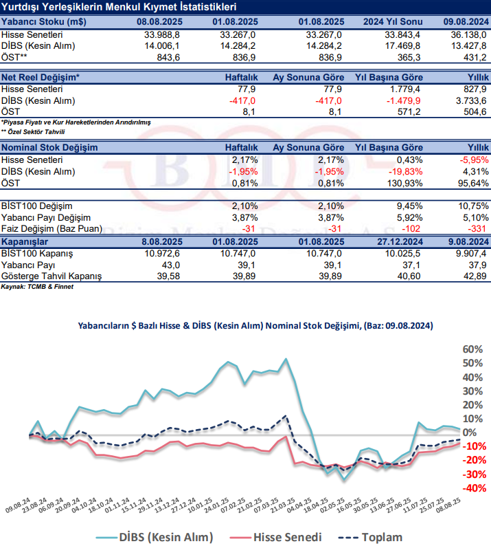 1-8 Ağustos 2025 haftasında yurt dışı yerleşik yatırımcılar, reel olarak (fiyat ve kur etkisinden arındırılmış) 77,9 milyon dolar hisse senedi alımı, 417,0 milyon dolar Devlet İç Borçlanma Senedi (DİBS-Kesin Alım1) satışı ve 8,1 milyon dolar Özel Sektör Tahvil alımı gerçekleştirdi. Böylelikle yurt dışı yerleşik yatırımcılar geçtiğimiz hafta toplam 331,0 milyon dolarlık menkul kıymet2 sattı. BİST100 Endeksi, 1-8 Ağustos 2025 tarihleri arasında %2,10 değer kazandı. 2 yıllık gösterge tahvil faizinde ise 31 baz puan düşüş yaşandı.