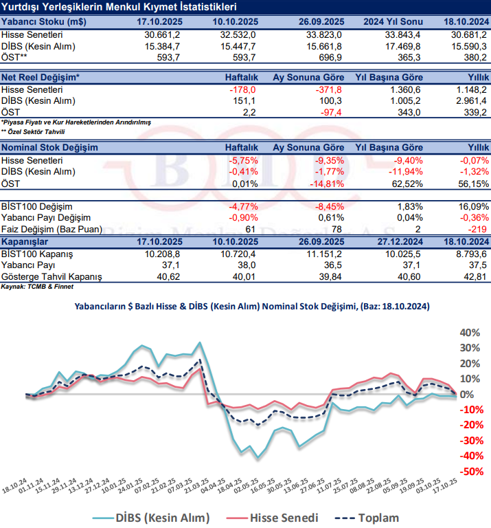 10-17 Ekim 2025 haftasında yurt dışı yerleşik yatırımcılar, reel olarak (fiyat ve kur etkisinden arındırılmış) 178,0 milyon dolar hisse senedi satışı, 151,1 milyon dolar Devlet İç Borçlanma Senedi (DİBS-Kesin Alım1) alımı ve 2,2 milyon dolar Özel Sektör Tahvil alımı gerçekleştirdi. Böylelikle yurt dışı yerleşik yatırımcılar geçtiğimiz hafta toplam 24,8 milyon dolarlık menkul kıymet2 sattı. BİST100 Endeksi, 10-17 Ekim 2025 tarihleri arasında %4,77 değer kaybetti. 2 yıllık gösterge tahvil faizinde ise 61 baz puan artış yaşandı.
