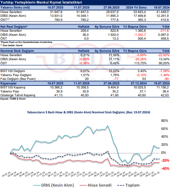 11 -18 Temmuz 2025 haftasında yurt dışı yerleşik yatırımcılar, reel olarak (fiyat ve kur etkisinden arındırılmış) 209,4 milyon dolar hisse senedi alımı, 36,0 milyon dolar Devlet İç Borçlanma Senedi (DİBS-Kesin Alım1) alımı ve 0,0 milyon dolar Özel Sektör Tahvil satışı gerçekleştirdi. Böylelikle yurt dışı yerleşik yatırımcılar geçtiğimiz hafta toplam 245,4 milyon dolarlık menkul kıymet2 aldı. BİST100 Endeksi, 11 -18 Temmuz 2025 tarihleri arasında %0,07 değer kazandı. 2 yıllık gösterge tahvil faizinde ise 20 baz puan artış yaşandı.