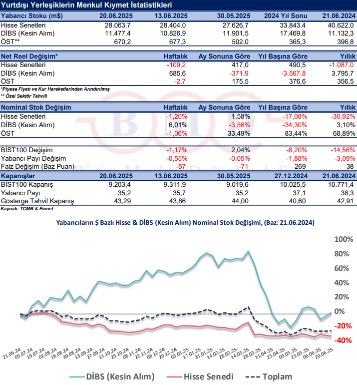 13-20 Haziran 2025 haftasında yurt dışı yerleşik yatırımcılar, reel olarak (fiyat ve kur etkisinden arındırılmış) 109,2 milyon dolar hisse senedi satışı, 685,6 milyon dolar Devlet İç Borçlanma Senedi (DİBS-Kesin Alım1) alımı ve 2,7 milyon dolar Özel Sektör Tahvil satışı gerçekleştirdi. Böylelikle yurt dışı yerleşik yatırımcılar geçtiğimiz hafta toplam 573,8 milyon dolarlık menkul kıymet2 aldı. BİST100 Endeksi, 13-20 Haziran 2025 tarihleri arasında %1,17 değer kaybetti. 2 yıllık gösterge tahvil faizinde ise 57 baz puan düşüş yaşandı.
