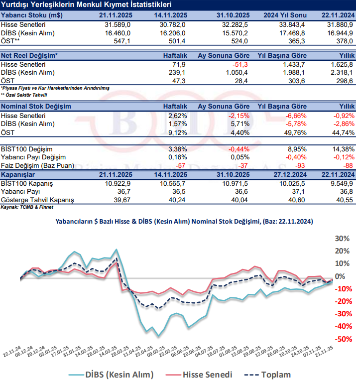 14-21 Kasım 2025 haftasında yurt dışı yerleşik yatırımcılar, reel olarak (fiyat ve kur etkisinden arındırılmış) 71,9 milyon dolar hisse senedi alımı, 239,1 milyon dolar Devlet İç Borçlanma Senedi (DİBS-Kesin Alım1 ) alımı ve 47,3 milyon dolar Özel Sektör Tahvil alımı gerçekleştirdi. Böylelikle yurt dışı yerleşik yatırımcılar geçtiğimiz hafta toplam 358,3 milyon dolarlık menkul kıymet2 aldı. BİST100 Endeksi, 14-21 Kasım 2025 tarihleri arasında %3,38 değer kazandı. 2 yıllık gösterge tahvil faizinde ise 57 baz puan düşüş yaşandı.