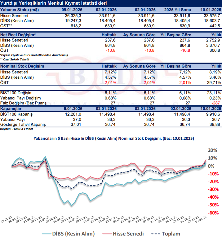 2-9 Ocak 2026 haftasında yurt dışı yerleşik yatırımcılar, reel olarak (fiyat ve kur etkisinden arındırılmış) 237,6 milyon dolar hisse senedi alımı, 864,8 milyon dolar Devlet İç Borçlanma Senedi (DİBS-Kesin Alım1) alımı ve 10,8 milyon dolar Özel Sektör Tahvil satışı gerçekleştirdi. Böylelikle yurt dışı yerleşik yatırımcılar geçtiğimiz hafta toplam 1.091,6 milyon dolarlık menkul kıymet2 aldı. BİST100 Endeksi, 2-9 Ocak 2026 tarihleri arasında %6,11 değer kazandı. 2 yıllık gösterge tahvil faizinde ise 27 baz puan artış yaşandı.