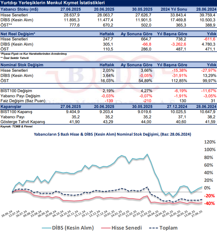 20-27 Haziran 2025 haftasında yurt dışı yerleşik yatırımcılar, reel olarak (fiyat ve kur etkisinden arındırılmış) 247,7 milyon dolar hisse senedi alımı, 305,1 milyon dolar Devlet İç Borçlanma Senedi (DİBS-Kesin Alım1 ) alımı ve 110,5 milyon dolar Özel Sektör Tahvil alımı gerçekleştirdi. Böylelikle yurt dışı yerleşik yatırımcılar geçtiğimiz hafta toplam 663,3 milyon dolarlık menkul kıymet2 aldı. BİST100 Endeksi, 20-27 Haziran 2025 tarihleri arasında %2,19 değer kazandı. 2 yıllık gösterge tahvil faizinde ise 139 baz puan düşüş yaşandı.