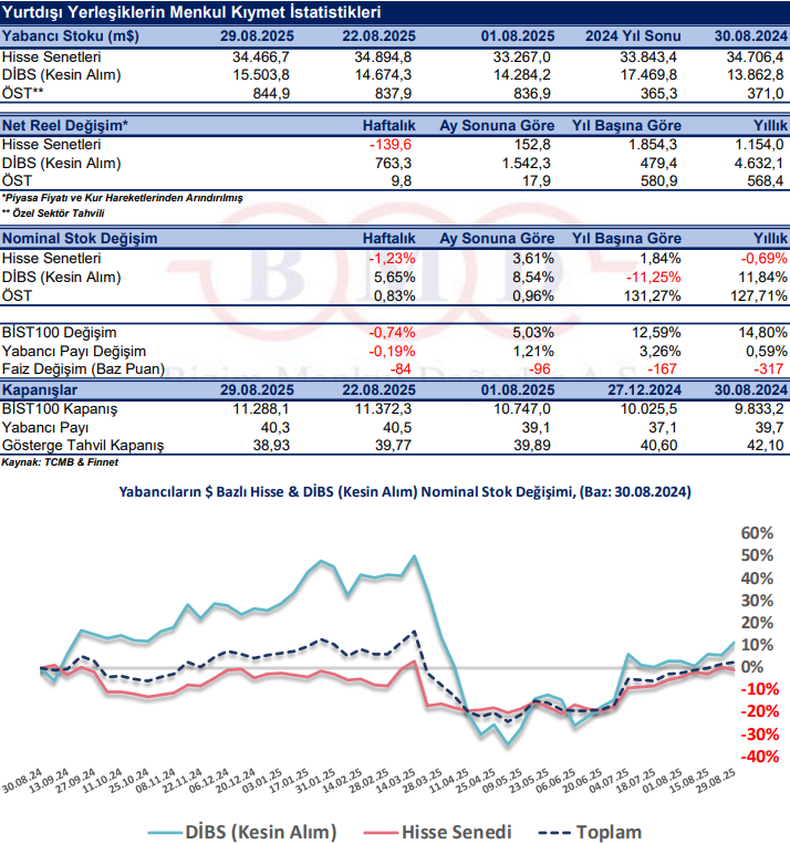 22-29 Ağustos 2025 haftasında yurt dışı yerleşik yatırımcılar, reel olarak (fiyat ve kur etkisinden arındırılmış) 139,6 milyon dolar hisse senedi satışı, 763,3 milyon dolar Devlet İç Borçlanma Senedi (DİBS-Kesin Alım1 ) alımı ve 9,8 milyon dolar Özel Sektör Tahvil alımı gerçekleştirdi. Böylelikle yurt dışı yerleşik yatırımcılar geçtiğimiz hafta toplam 633,4 milyon dolarlık menkul kıymet2 aldı. BİST100 Endeksi, 22-29 Ağustos 2025 tarihleri arasında %0,74 değer kaybetti. 2 yıllık gösterge tahvil faizinde ise 84 baz puan düşüş yaşandı.