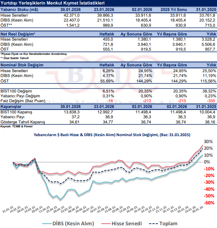Hisse senedi piyasasında yabancıların payı 30 Ocak itibariyle %37,2 olurken önceki haftada bu oran %36,9 seviyesindeydi. 2025 yılı kapanışında %36,3 olan yabancı payı 1 sene öncesinde ise %36,9 idi.