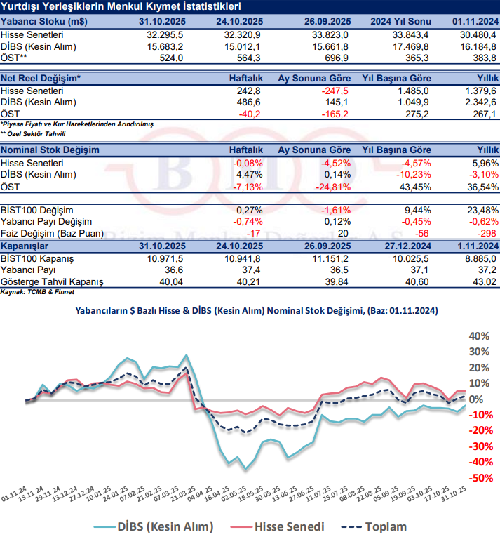 24-31 Ekim 2025 haftasında yurt dışı yerleşik yatırımcılar, reel olarak (fiyat ve kur etkisinden arındırılmış) 242,8 milyon dolar hisse senedi alımı, 486,6 milyon dolar Devlet İç Borçlanma Senedi (DİBS-Kesin Alım1) alımı ve 40,2 milyon dolar Özel Sektör Tahvil satışı gerçekleştirdi. Böylelikle yurt dışı yerleşik yatırımcılar geçtiğimiz hafta toplam 689,2 milyon dolarlık menkul kıymet2 aldı. BİST100 Endeksi, 24-31 Ekim 2025 tarihleri arasında %0,27 değer kazandı. 2 yıllık gösterge tahvil faizinde ise 17 baz puan düşüş yaşandı.