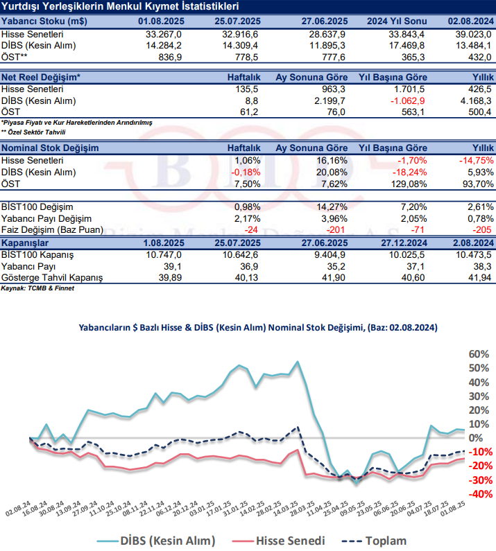 25 Temmuz-1 Ağustos 2025 haftasında yurt dışı yerleşik yatırımcılar, reel olarak (fiyat ve kur etkisinden arındırılmış) 135,5 milyon dolar hisse senedi alımı, 8,8 milyon dolar Devlet İç Borçlanma Senedi (DİBS-Kesin Alım1) alımı ve 61,2 milyon dolar Özel Sektör Tahvil alımı gerçekleştirdi. Böylelikle yurt dışı yerleşik yatırımcılar geçtiğimiz hafta toplam 205,5 milyon dolarlık menkul kıymet2 aldı. BİST100 Endeksi, 25 Temmuz-1 Ağustos 2025 tarihleri arasında %0,98 değer kazandı. 2 yıllık gösterge tahvil faizinde ise 24 baz puan düşüş yaşandı.