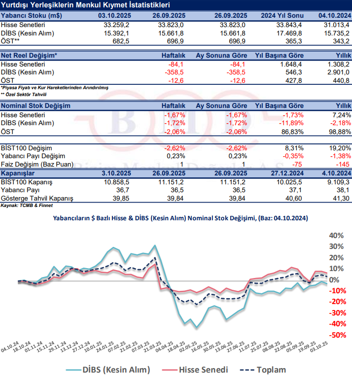 26 Eylül-3 Ekim 2025 haftasında yurt dışı yerleşik yatırımcılar, reel olarak (fiyat ve kur etkisinden arındırılmış) 84,1 milyon dolar hisse senedi satışı, 358,5 milyon dolar Devlet İç Borçlanma Senedi (DİBS-Kesin Alım1) satışı ve 12,6 milyon dolar Özel Sektör Tahvil satışı gerçekleştirdi. Böylelikle yurt dışı yerleşik yatırımcılar geçtiğimiz hafta toplam 455,2 milyon dolarlık menkul kıymet2 sattı. BİST100 Endeksi, 26 Eylül-3 Ekim 2025 tarihleri arasında %2,62 değer kaybetti. 2 yıllık gösterge tahvil faizinde ise 1 baz puan artış yaşandı.