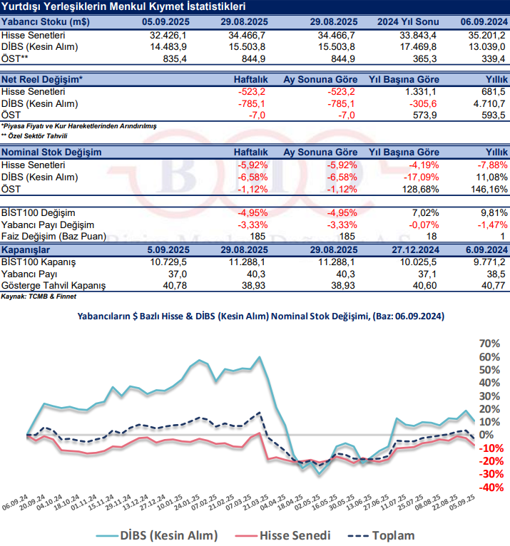 29 Ağustos-5 Eylül 2025 haftasında yurt dışı yerleşik yatırımcılar, reel olarak (fiyat ve kur etkisinden arındırılmış) 523,2 milyon dolar hisse senedi satışı, 785,1 milyon dolar Devlet İç Borçlanma Senedi (DİBS-Kesin Alım1) satışı ve 7,0 milyon dolar Özel Sektör Tahvil satışı gerçekleştirdi. Böylelikle yurt dışı yerleşik yatırımcılar geçtiğimiz hafta toplam 1.315,3 milyon dolarlık menkul kıymet2 sattı. BİST100 Endeksi, 29 Ağustos-5 Eylül 2025 tarihleri arasında %4,95 değer kaybetti. 2 yıllık gösterge tahvil faizinde ise 185 baz puan artış yaşandı.