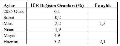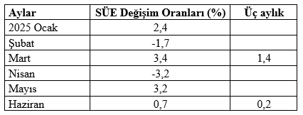 Aşağıdaki tablo mevsim ve takvim etkisinden arındırılmış sanayi üretim endeksinin (SÜE) önceki yılın aynı ayına göre değişim oranını gösteriyor (kaynak: TÜİK: Sanayi Üretim Endeksi, Haziran 2025, ek tablo 1.)