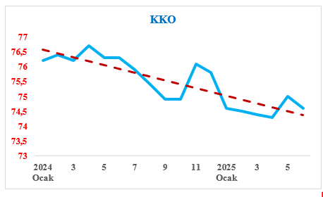 Grafik bize sanayide kapasite kullanım oranlarının düşüş eğiliminde olduğunu gösteriyor ve bu durum SÜE endeksindeki gelişmeyi doğruluyor.