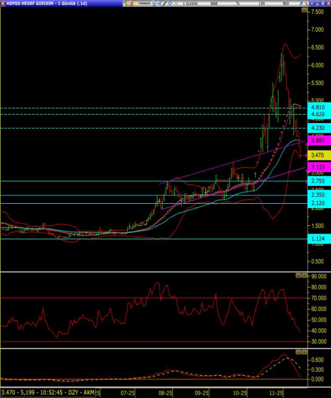 • Geri çekilmelerin devamında bollinger alt banda denk gelen 3.39 destek seviyesinde mevcut pozisyonlar korunabilir. Bu seviyenin altına yerleştiği takdirde baskı daha da artabilir.