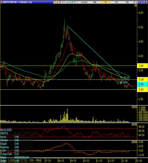3,18–3,02 bandı kısa vadede önemli bir destek alanı olarak öne çıkıyor; bu bölgenin altına sarkmalarda 2,83 seviyesi sonraki ana destek olarak izlenebilir.