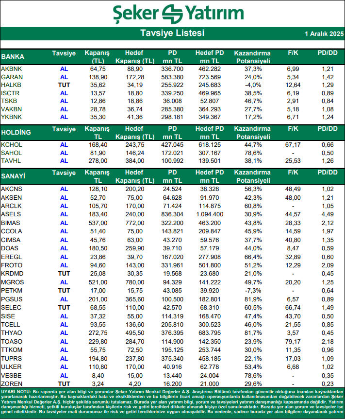 Kaynak: Şeker Yatırım Tavsiye Listesi