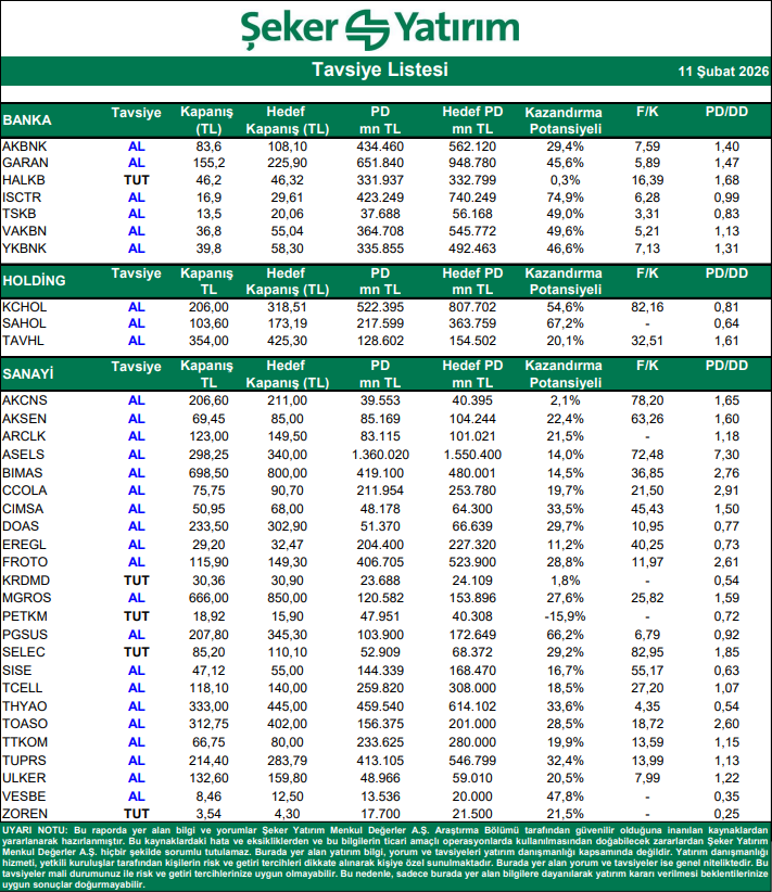 Kaynak: Şeker Yatırım Tavsiye Listesi