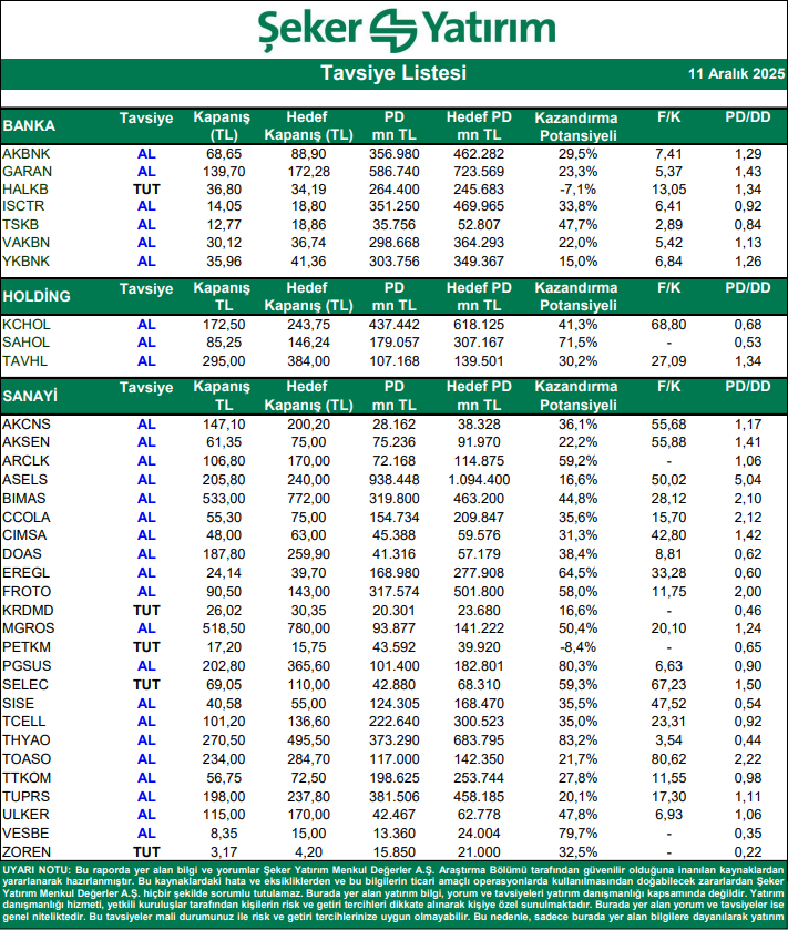 Kaynak: Şeker Yatırım Tavsiye Listesi