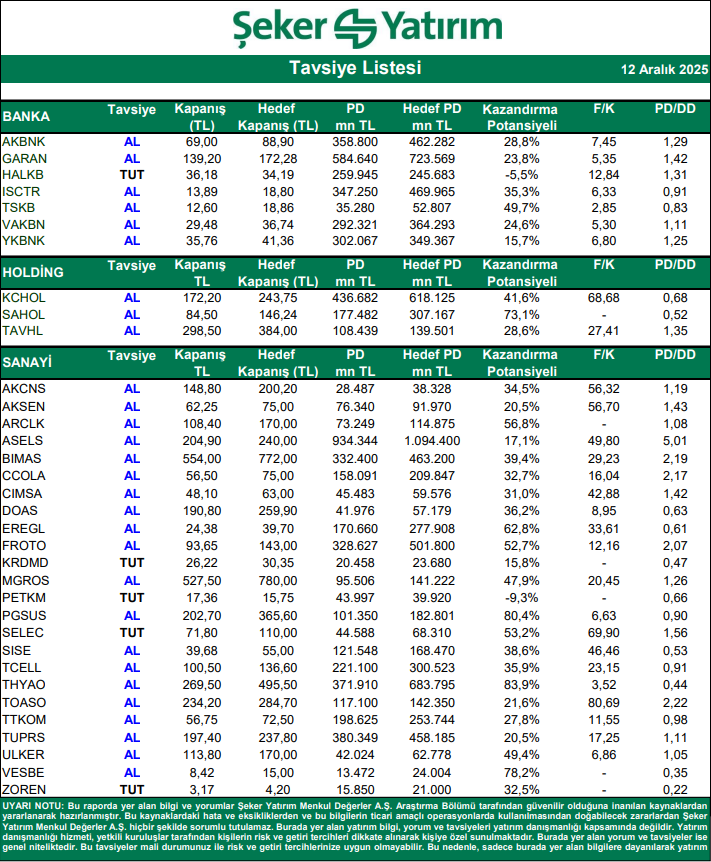 Kaynak: Şeker Yatırım Tavsiye Listesi