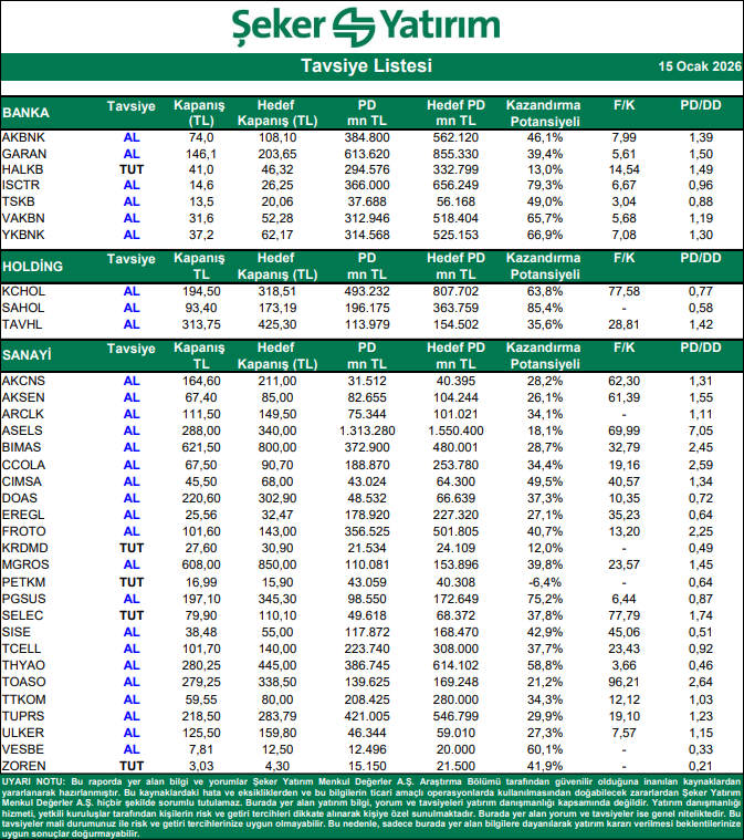 Kaynak: Şeker Yatırım Tavsiye Listesi